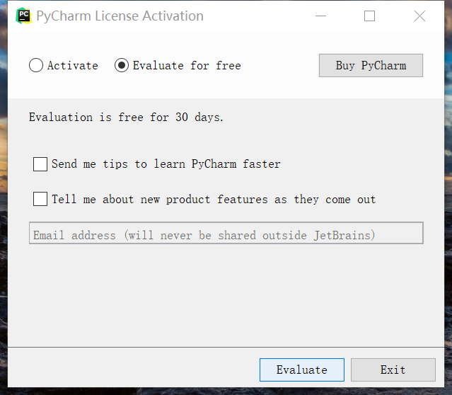前面四步完全一样,但是启动软件之前会提示需要激活。这一步需要购买pycharm(先别购买),选择试用。