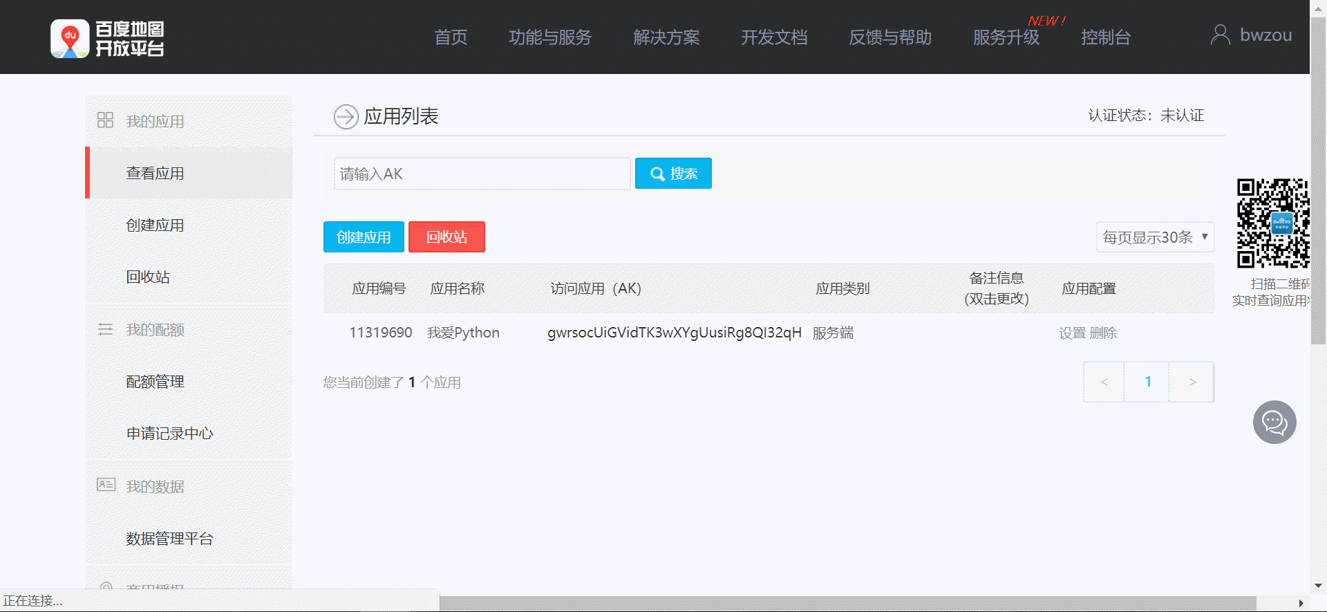如果我们想使用百度、高德等国内地图服务商的服务,我们需要首先到官网申请对应的key,例:我们首先到官网申请key,这里是我申请的结果: