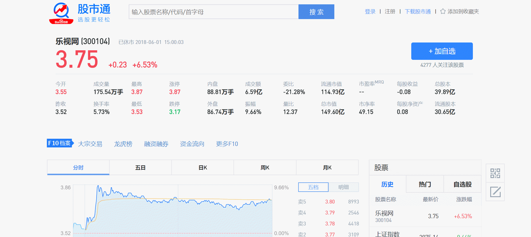 股票数据可以从百度股票查看,比如我们想查看乐视网股票,那我们就在搜索框中输入‘乐视网’然后回车即可看到乐视网股票信息。