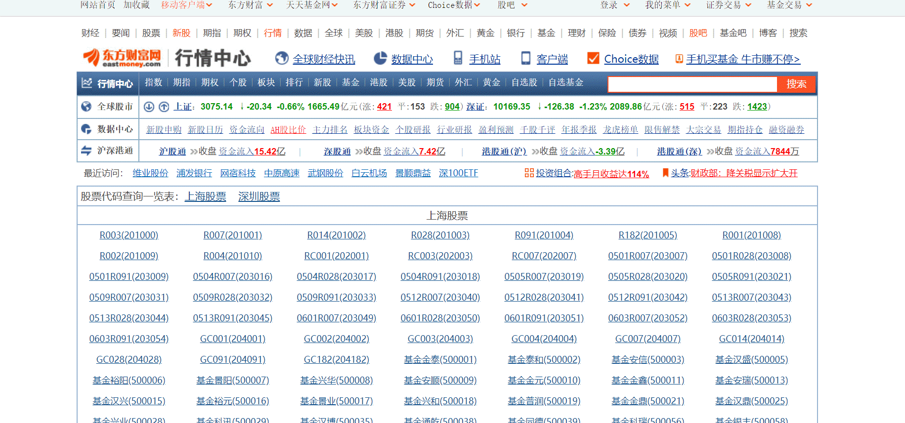 由于百度股票只有单个股票的信息,所以还需要当前股票市场中所有股票的列表,在这里我们选择东方财富网,界面如下图所示